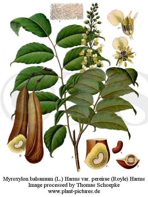 Stammpflanze: Myroxylon balsamum (L.) HARMS var. pereirae (ROYLE) HARMS. / Perubalsambaum [Fam. Fabaceae / Schmetterlingsblütengewächse]. Synonyme: Myrospermum pereirae ROYLE [Basionym], Myroxylon pereirae (ROYLE) KLOTZSCH, Toluifera pereirae (ROYLE) BAILL., Myroxylon Sonsonatense KLOTZSCH. Englisch: balsam-of-Peru, balsam-of-Peru-tree, Peru balsam. |